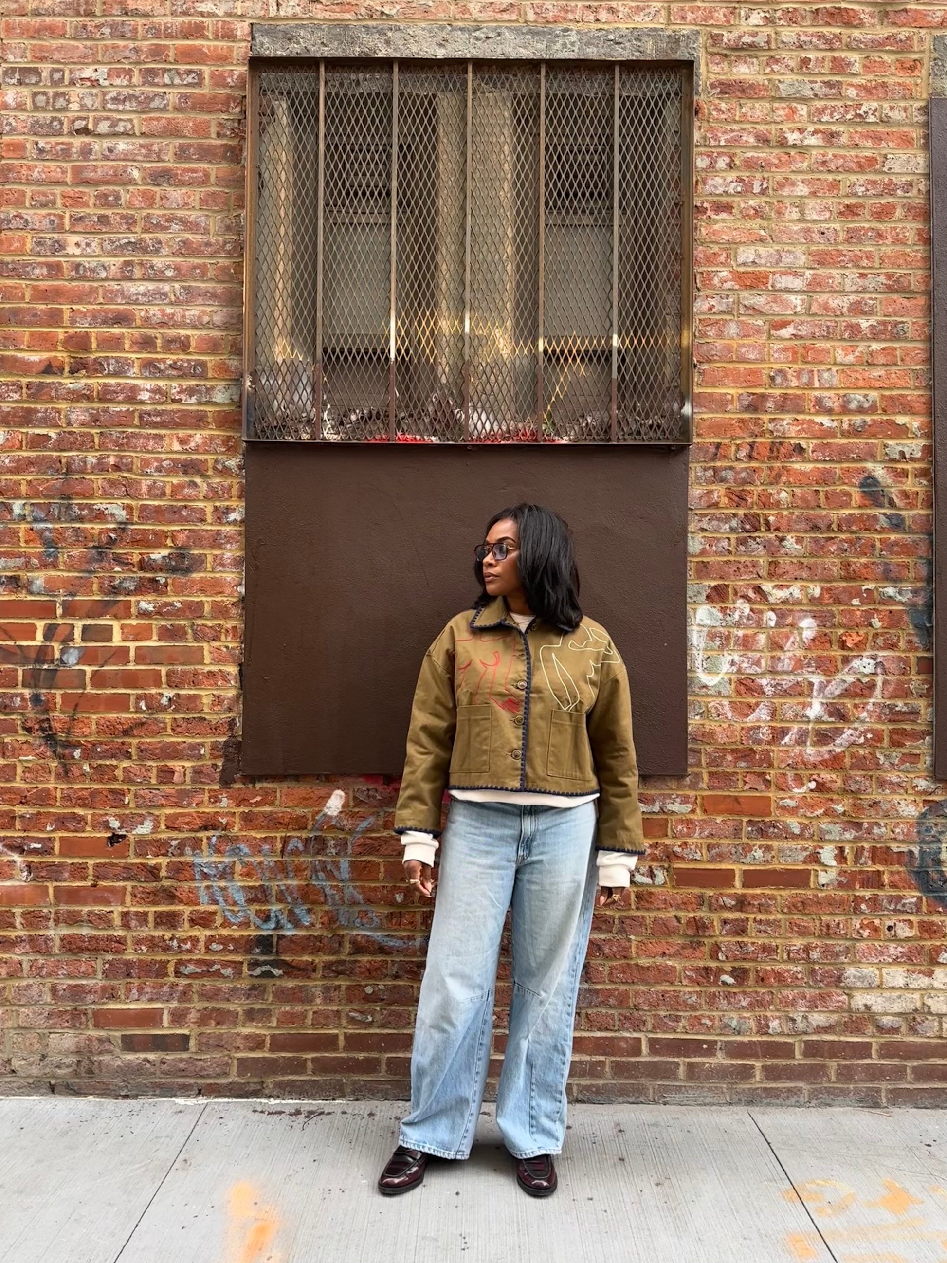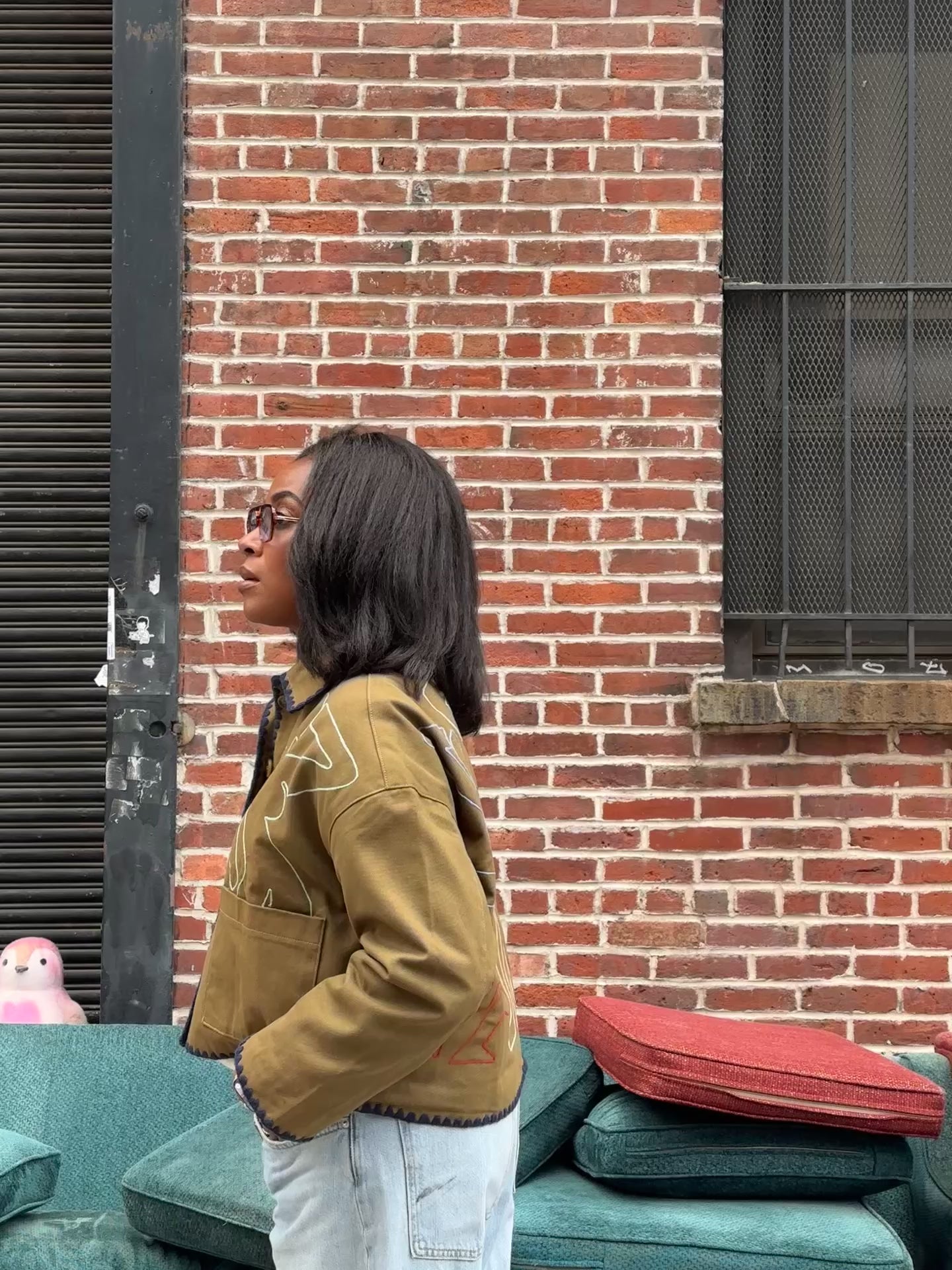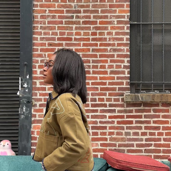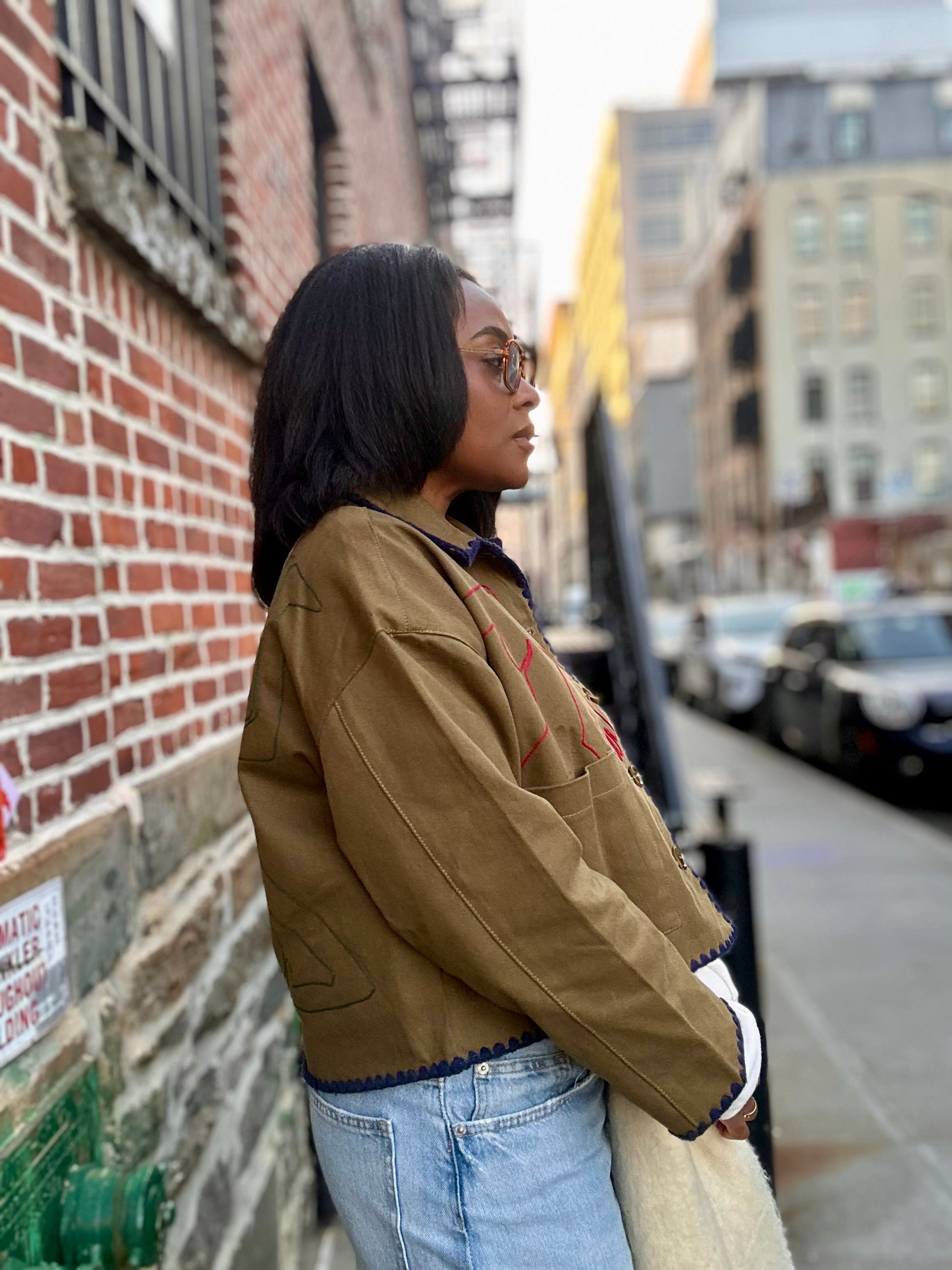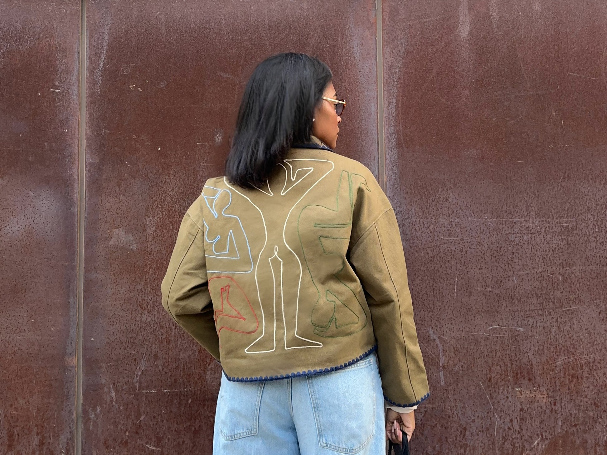 Inspired by the iconic work of Aaron Douglas, this jacket brings his bold silhouettes and expressive linework into a modern, wearable piece. The embroidered figures echo Douglas’s signature movement and storytelling, turning the jacket into a canvas that celebrates culture and form.